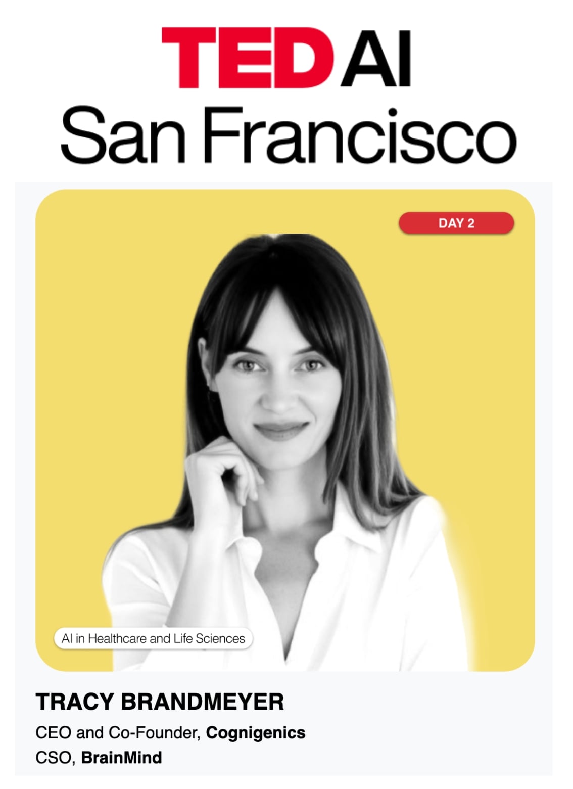 | October 23, 2025 | ![]() Cognigenics CEO and Co-Founder Tracy Brandmeyer was a panelist at the 2025 TEDAI San Francisco convention. She shared her expertise on AI and its future in healthcare and life sciences. |